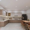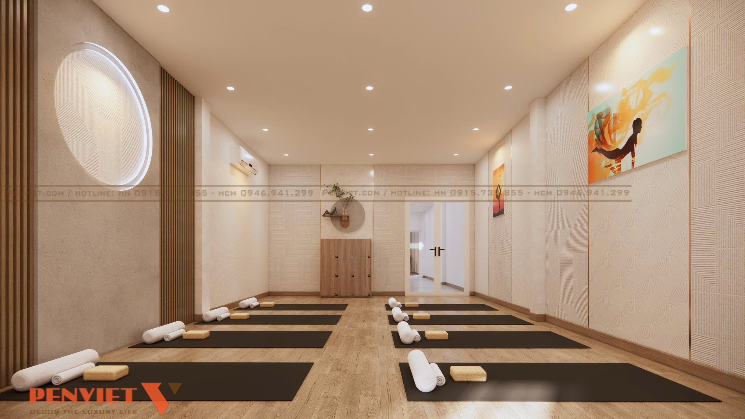 Phòng yoga sử dụng vật liệu gỗ tự nhiên, mang lại cảm giác ấm cúng và thư thái. Các mảng tường trang trí bằng giấy dán tường họa tiết vân quạt nhẹ kết hợp tranh nghệ thuật, tạo nên không gian hài hòa và tràn đầy năng lượng tích cực. Hệ thống đèn âm trần cùng ánh sáng gián tiếp giúp căn phòng luôn có độ sáng dịu, phù hợp cho các hoạt động thiền, yoga, giãn cơ.