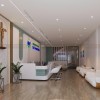 Bước vào sảnh, người nhìn dễ dàng cảm nhận được phong cách thiết kế tinh tế với gam màu trắng chủ đạo kết hợp xanh pastel và gỗ sáng màu. Quầy lễ tân được thiết kế với đường cong mềm mại, viền bo tròn giúp tạo cảm giác thân thiện và an toàn.