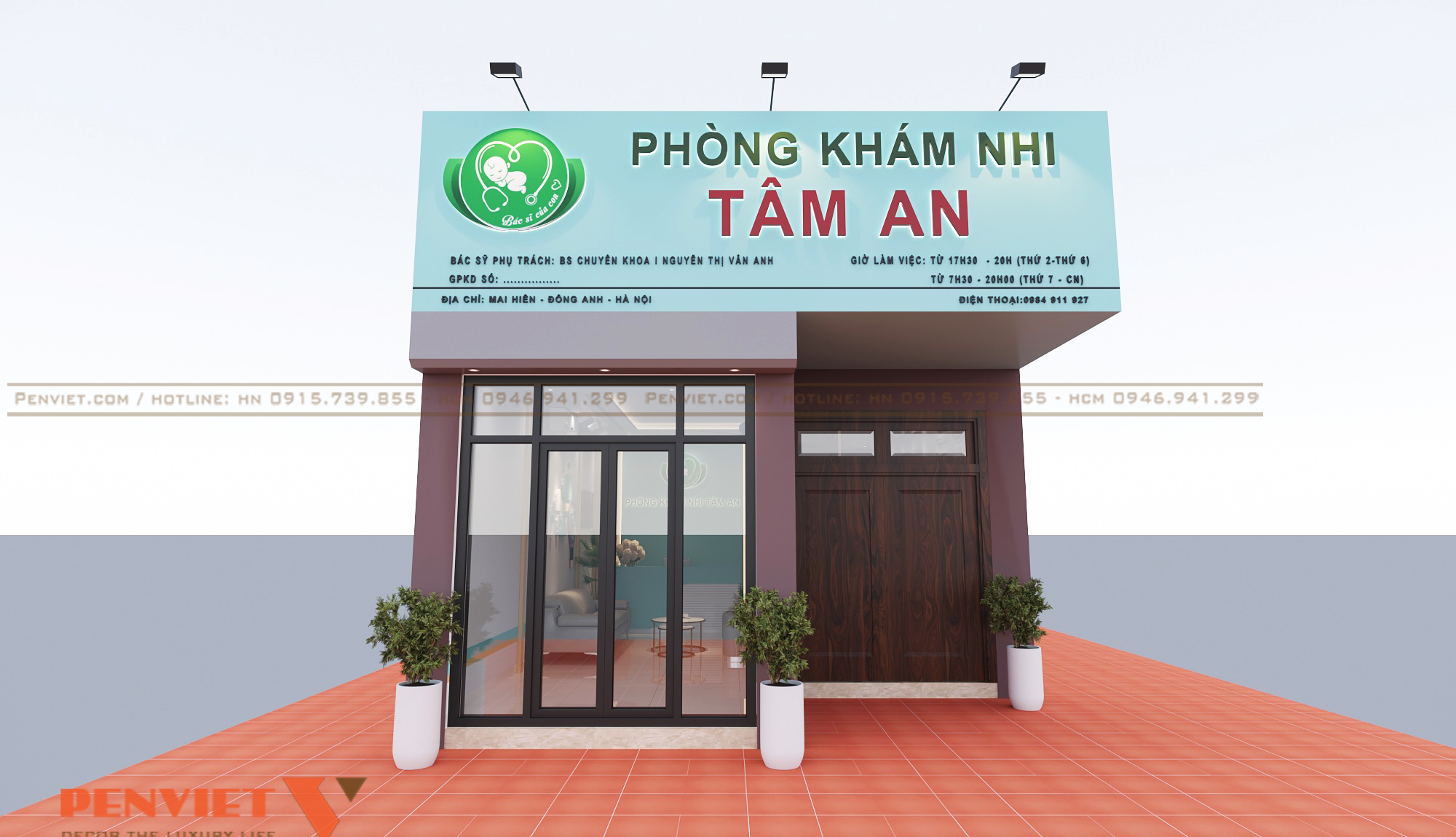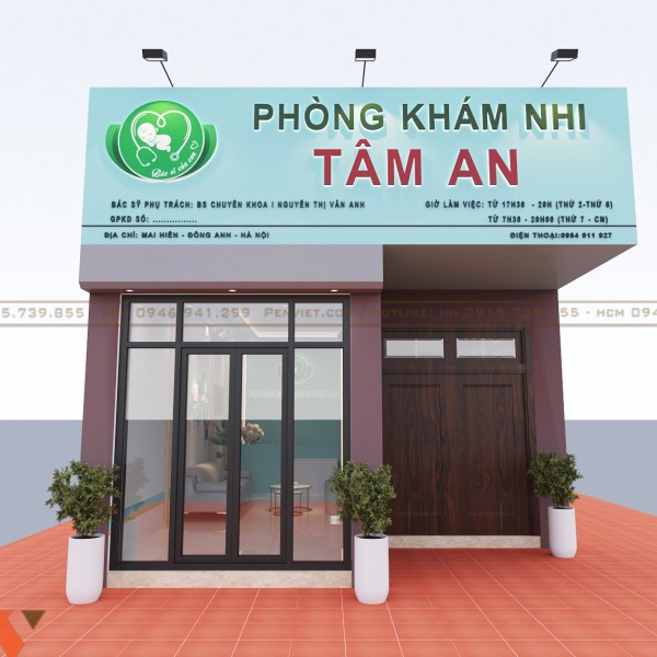 Phần mặt tiền của phòng khám nhi Tâm An được thiết kế hiện đại, nổi bật với bảng hiệu xanh ngọc nhã nhặn, in rõ tên thương hiệu cùng thông tin bác sĩ phụ trách. Cách phối màu được lựa chọn có chủ đích, vừa thể hiện tính chuyên môn, vừa gợi cảm giác thân thiện đặc trưng của một cơ sở y tế dành cho trẻ nhỏ.