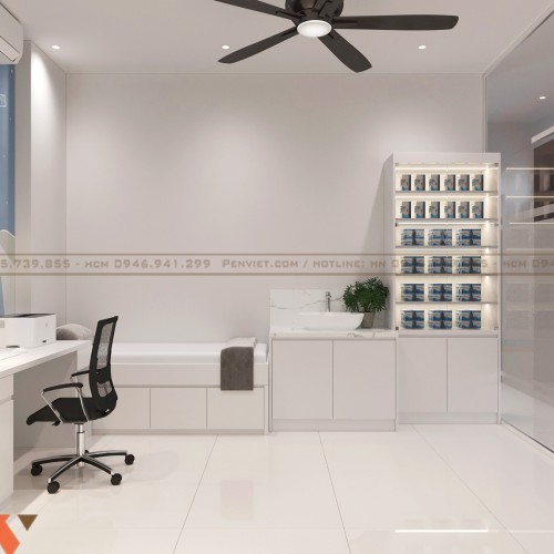 Khu vực khám bệnh được bố trí hợp lý, đảm bảo công năng và quy trình làm việc của bác sĩ. Nội thất trong phòng được sắp xếp gọn gàng với bàn làm việc, ghế xoay, tủ thiết bị và ghế khám hiện đại. Màu sắc chủ đạo vẫn là tông trắng kết hợp ghi sáng, giúp không gian luôn sạch sẽ và chuyên nghiệp.