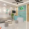 Bước vào bên trong, khu vực lễ tân được xem là “bộ mặt” chính của phòng khám, nơi ghi dấu ấn đầu tiên với khách hàng. Không gian được thiết kế với quầy lễ tân màu xanh pastel kết hợp các đường viền vàng nhạt, tạo cảm giác tươi mới và dễ chịu. Logo thương hiệu được đặt ở trung tâm bức tường phía sau quầy, với ánh sáng hắt nhẹ tạo hiệu ứng sang trọng mà không quá phô trương.