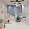 Hệ thống đèn LED âm trần được bố trí hợp lý để đảm bảo đủ độ sáng cho mọi khu vực, đặc biệt là tại quầy lễ tân và bàn khám. Ngoài ra, việc lắp đặt quạt trần kết hợp điều hòa giúp không khí được lưu thông tốt hơn, đảm bảo môi trường thoáng mát quanh năm. Đây là một yếu tố quan trọng đối với những phòng khám có lưu lượng khách ra vào thường xuyên.