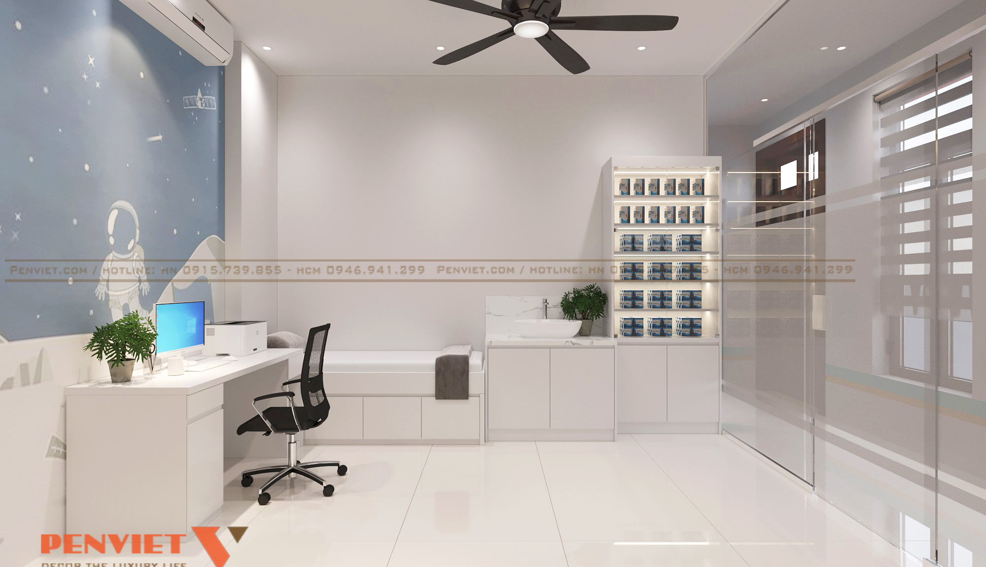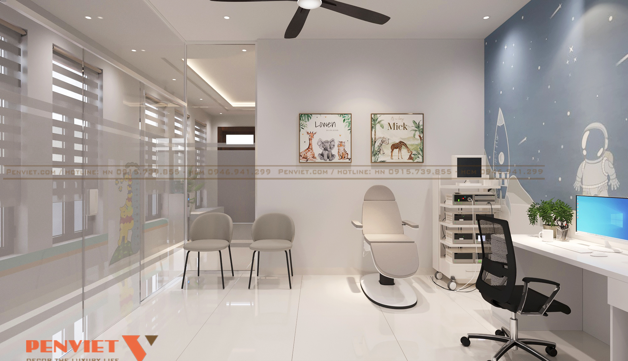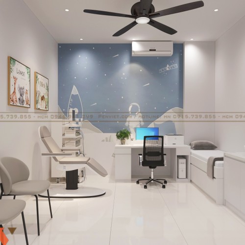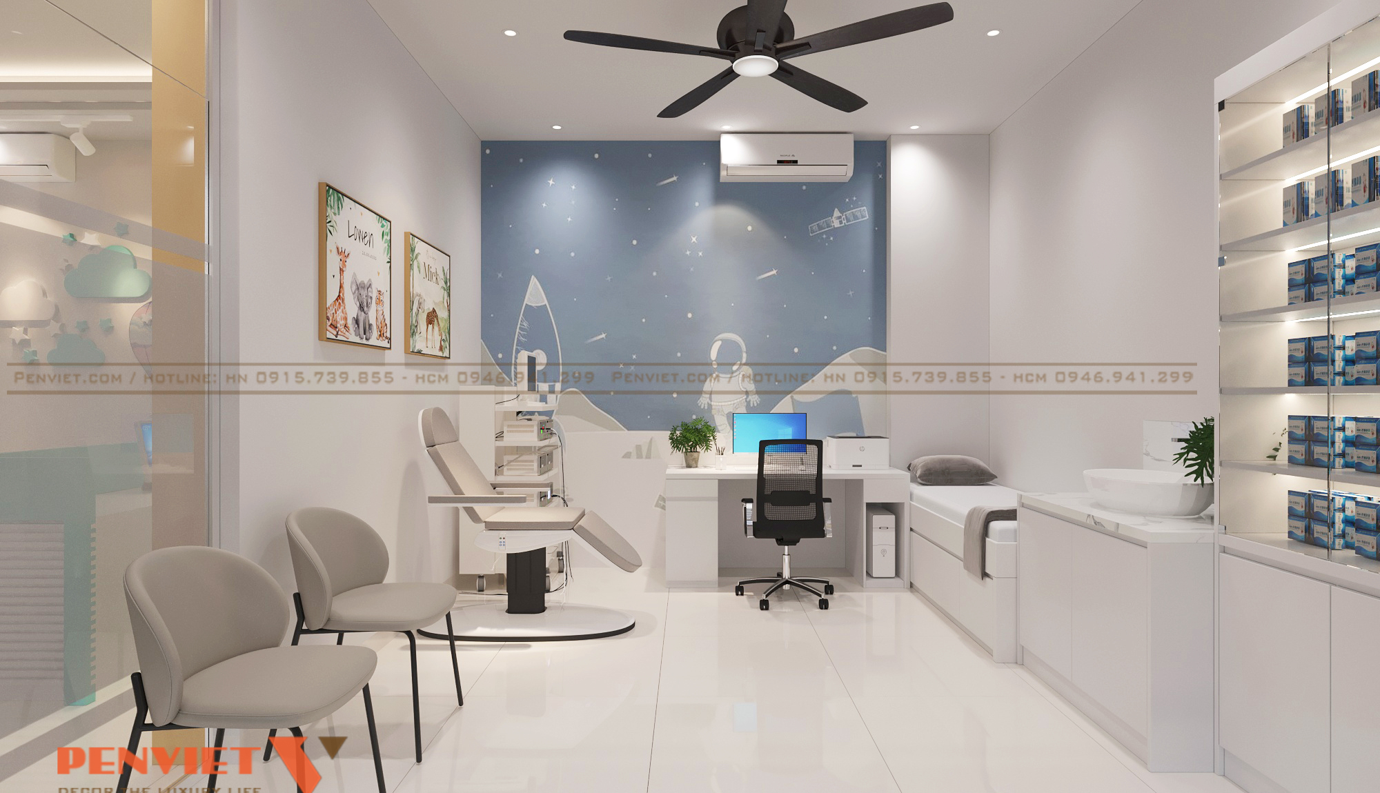 Một điểm nổi bật trong thiết kế là mảng tường lớn phía sau bàn khám được trang trí bằng hình ảnh phi hành gia và tàu vũ trụ, tạo cảm giác sinh động và kích thích trí tưởng tượng của trẻ nhỏ. Nhờ cách phối hợp màu sắc nhẹ nhàng, các chi tiết trang trí không làm rối mắt mà ngược lại còn khiến không gian trở nên gần gũi, giúp bé giảm căng thẳng khi thăm khám.