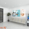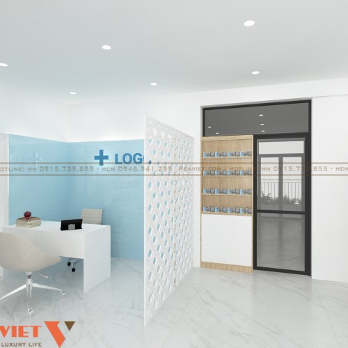 Phòng khám sử dụng phong cách hiện đại tối giản, tập trung vào các yếu tố hình khối, ánh sáng và màu sắc nhẹ nhàng để tạo cảm giác sạch sẽ, thoải mái. Tông màu chủ đạo là trắng kết hợp xanh nhạt, vừa giúp không gian rộng hơn, vừa mang lại cảm giác dịu mắt và thư giãn cho người bệnh.
