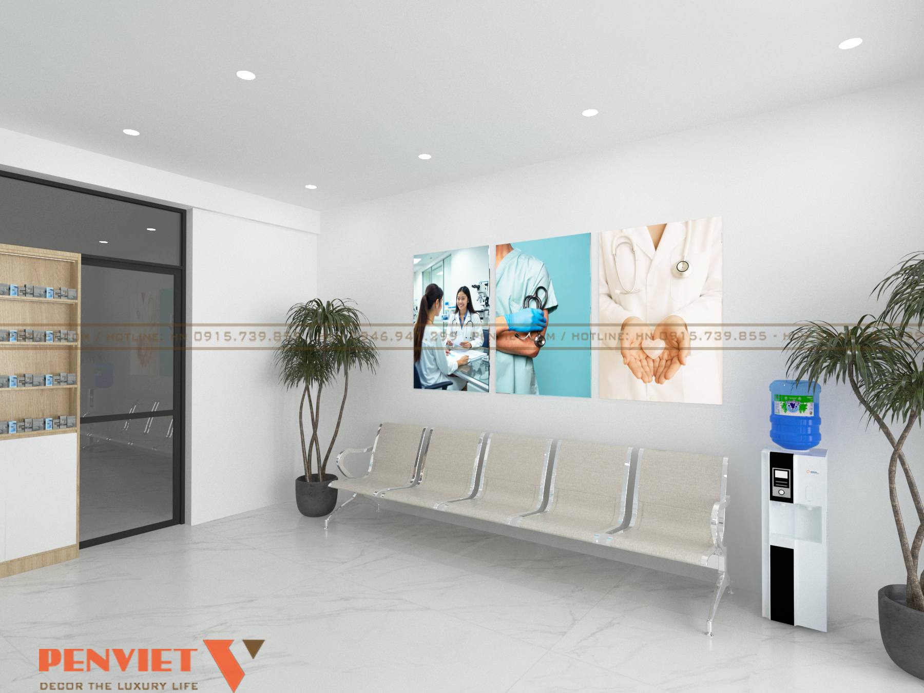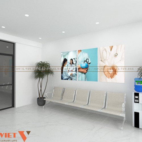 Ngay khi bước vào phòng khám, khách hàng sẽ cảm nhận được không gian rộng rãi, thoáng mát và thân thiện. Khu vực chờ được bố trí gọn gàng với hàng ghế inox sáng bóng mang đặc trưng của các cơ sở y tế chuyên nghiệp. Bức tường phía sau ghế được trang trí bằng bộ tranh y khoa thể hiện hình ảnh bác sĩ, thiết bị y tế và thông điệp chăm sóc sức khỏe, giúp giảm cảm giác căng thẳng cho bệnh nhân khi chờ khám.