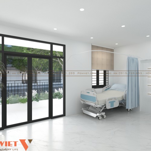 Tấm rèm treo nhẹ phía đầu giường cho phép bác sĩ linh hoạt trong việc tạo không gian riêng tư khi cần. Vị trí giường được đặt cạnh tường để tối ưu diện tích di chuyển và tạo khoảng cách an toàn giữa bệnh nhân và khu vực tiếp khách.