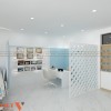 Sàn nhà được ốp gạch vân đá sáng bóng, dễ lau chùi, tạo hiệu ứng sang trọng mà không gây lạnh lẽo. Các mảng tường được giữ trơn phẳng, hạn chế chi tiết rườm rà, tạo nền cho các điểm nhấn như logo, kệ trưng bày và bảng chứng nhận. Hệ thống ánh sáng trần được bố trí đồng đều, sử dụng đèn LED âm trần để mang lại độ sáng ổn định, tiết kiệm điện năng và giúp không gian luôn tươi mới.