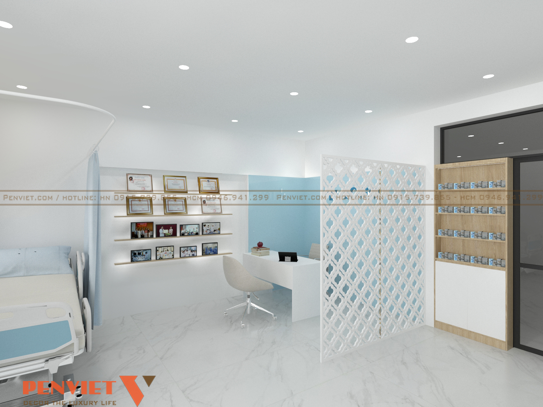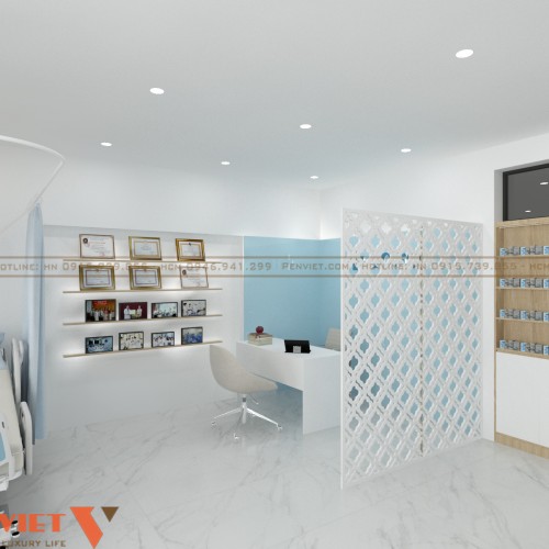 Không gian làm việc của bác sĩ được bố trí phía sau vách ngăn CNC họa tiết. Tấm vách này không chỉ có tác dụng phân chia không gian mà còn đóng vai trò như yếu tố trang trí, mang đến cảm giác nhẹ nhàng, mềm mại và tinh tế.