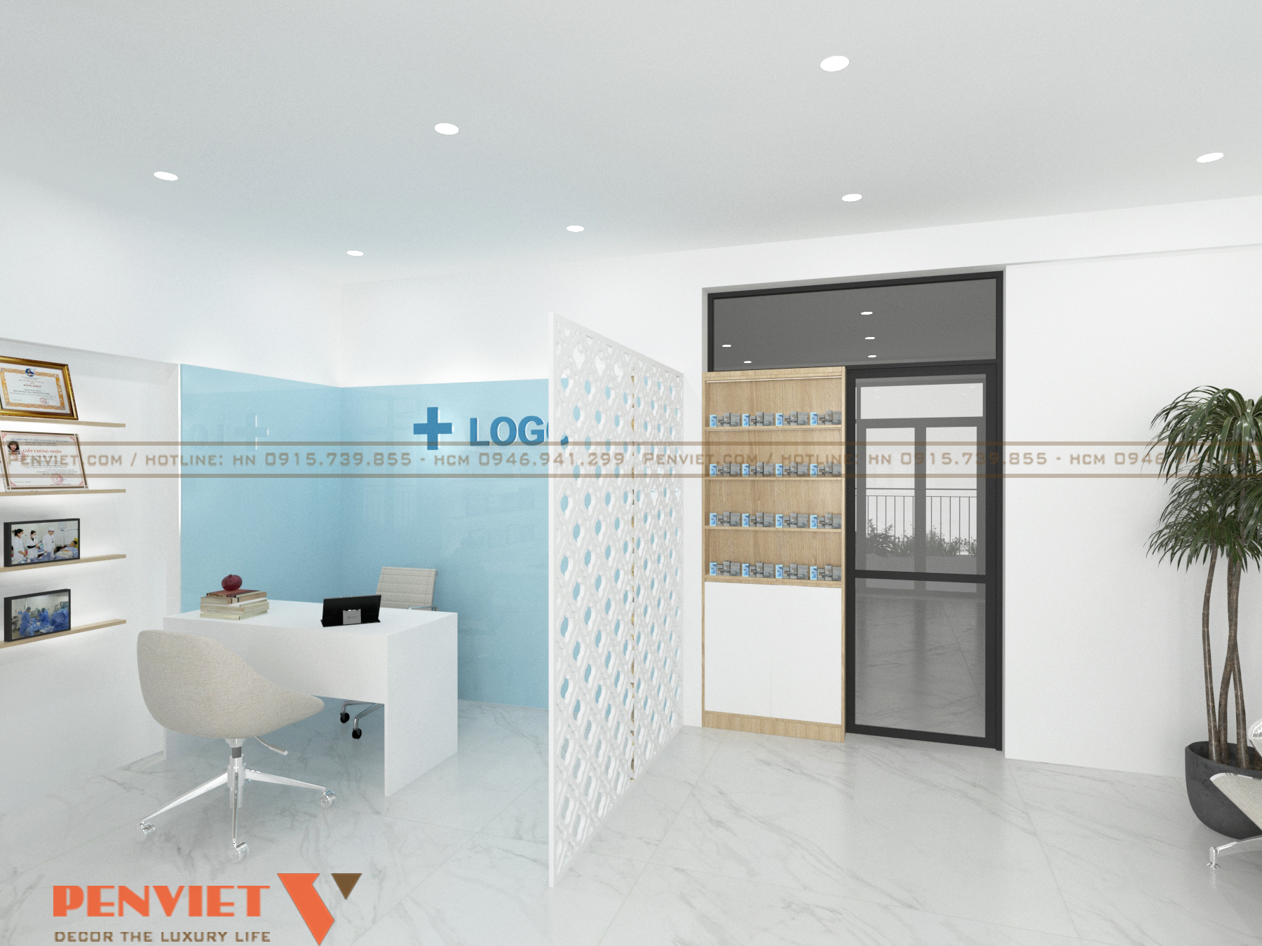 Khu vực bàn làm việc được thiết kế theo hướng tối giản, gồm bàn trắng sáng kết hợp ghế xoay hiện đại, vừa tạo điểm nhấn vừa thuận tiện cho việc tư vấn và ghi chép. Phía sau bàn làm việc là mảng tường xanh pastel cùng logo phòng khám được bố trí nổi bật, kết hợp đèn hắt sáng tinh tế giúp tạo ấn tượng thương hiệu rõ nét.