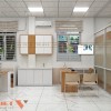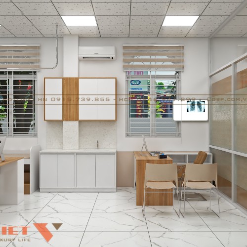 Phòng khám được trang bị đầy đủ bàn làm việc cho bác sĩ, giường bệnh, tủ hồ sơ và thiết bị hỗ trợ. Nội thất sử dụng gỗ công nghiệp phủ melamine để đảm bảo độ bền, dễ lau chùi, kháng khuẩn. Khu vực truyền dịch sạch sẽ, được ngăn cách bằng kính và rèm để đảm bảo riêng tư mà vẫn dễ quan sát.