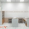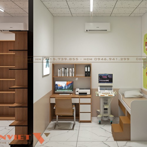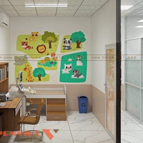 Một không gian nổi bật khác của thiết kế phòng khám nội tổng hợp bác sĩ Mẫu là phòng siêu âm và chăm sóc trẻ nhỏ. Phòng được ngăn cách bằng tường kín đảm bảo sự riêng tư. Bên trong có giường nhỏ với ga trải màu trung tính, tranh dán tường hình động vật vui nhộn và màu sắc tươi sáng tạo sự thân thiện với trẻ em.