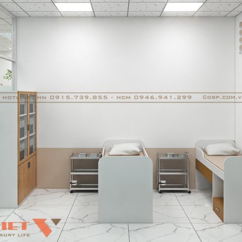 Phòng nghỉ bệnh nhân được bố trí hai giường đơn với đầu giường gắn thiết bị y tế cơ bản đảm bảo bệnh nhân được theo dõi sát sao. Mỗi giường đều có rèm kéo để tạo không gian riêng tư khi cần thiết. Không gian hành lang thông thoáng, kính mờ và vách ngăn giúp chia các phòng chức năng mà vẫn đảm bảo ánh sáng tự nhiên lan tỏa khắp khu vực.
