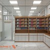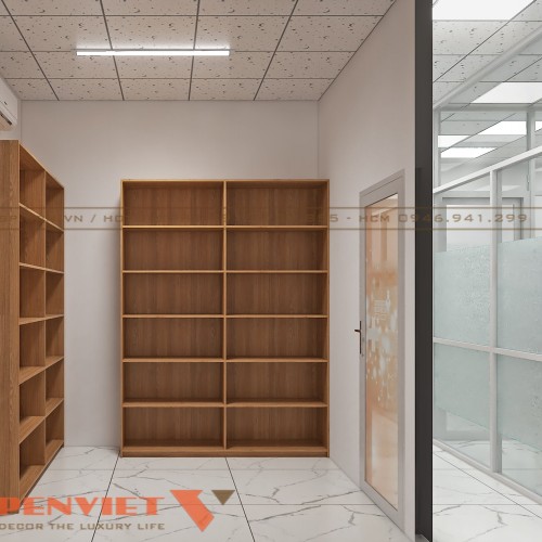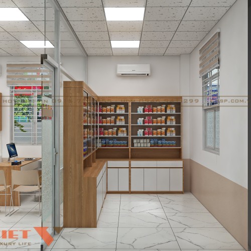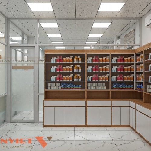 Khu vực trưng bày các loại thuốc của thiết kế phòng khám nội tổng hợp bác sĩ Mẫu tại Đồng Nai sắp xếp gọn gàng. Hệ thống tủ kệ làm từ gỗ MDF cốt xanh bền bỉ có nhiều ngăn nhỏ thích hợp bày biện thuốc.
