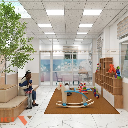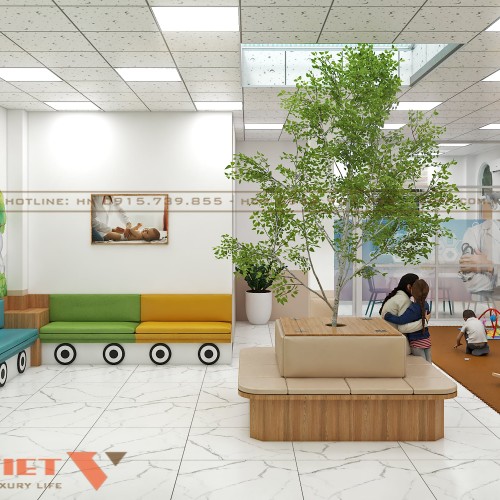 Nổi bật nhất trong thiết kế là khu vực vui chơi trẻ em, được bố trí ngay sát khu lễ tân, dành riêng cho các bé. Không gian này được lát thảm chống trơn màu nâu đất, kết hợp với nhiều món đồ chơi màu sắc và trò chơi trí tuệ phù hợp lứa tuổi trẻ nhỏ.
