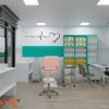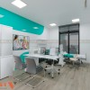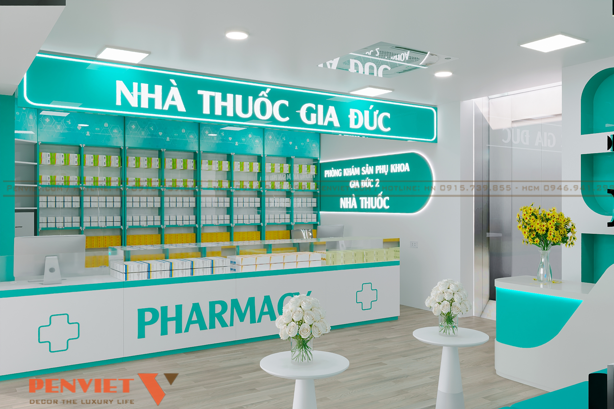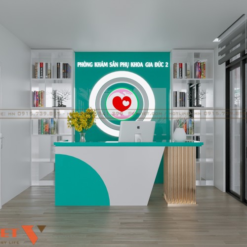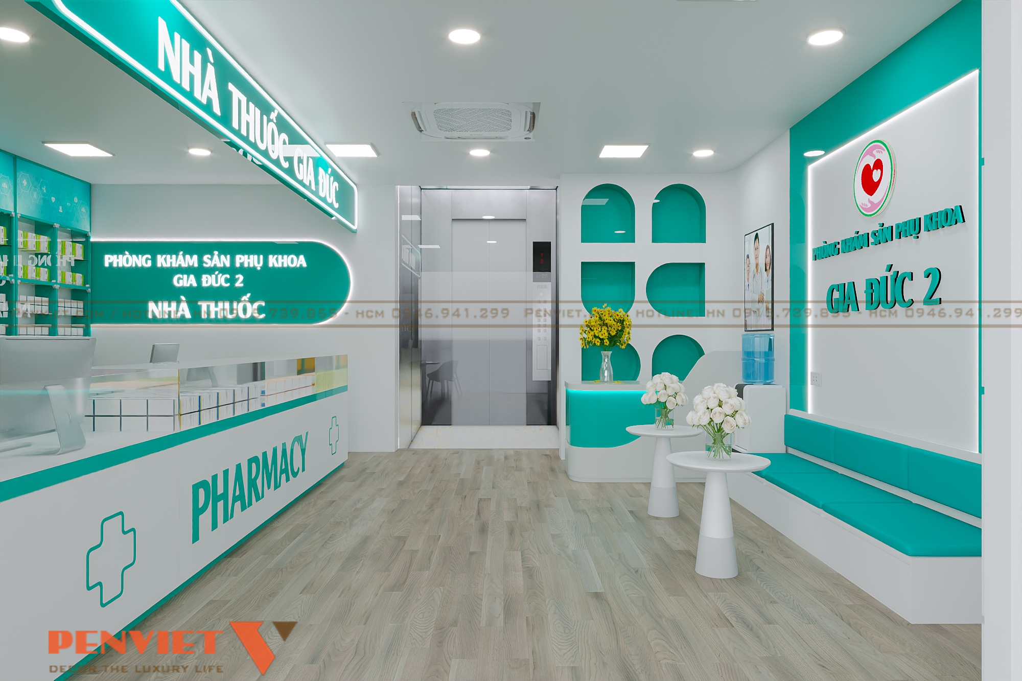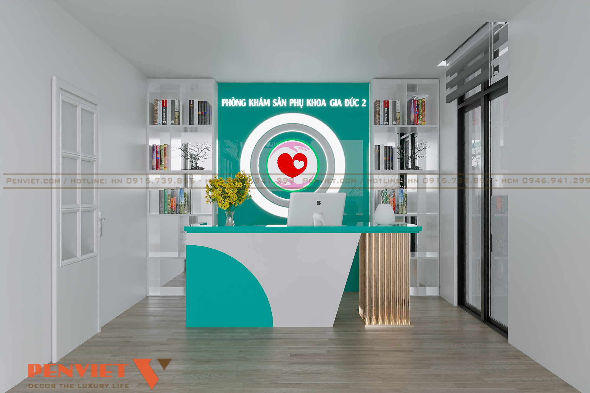 Màu trắng giúp không gian trở nên rộng và sáng hơn, trong khi sắc xanh ngọc mang lại cảm giác an tâm, nhẹ nhàng, tạo hiệu ứng xoa dịu tâm lý cho bệnh nhân. Cách phối màu khéo léo giữa hai gam này không chỉ giúp cân bằng thị giác mà còn góp phần tạo nên bản sắc nhận diện riêng cho thương hiệu phòng khám Gia Đức 2.