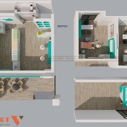 Màu xanh ngọc tiếp tục được sử dụng làm điểm nhấn ở mảng tường chính, mang lại cảm giác dịu nhẹ và thân thiện. Các chi tiết nhỏ như tay nắm cửa, đèn chiếu sáng, tranh treo tường đều được đồng bộ theo một ngôn ngữ thiết kế chung, thể hiện sự tỉ mỉ trong từng góc nhỏ.