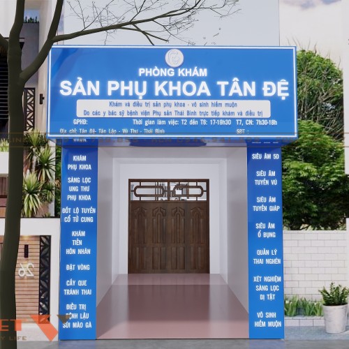 Khu vực biển bảng quảng cáo của thiết kế phòng khám sản Tân Đệ nổi bật với nhiều kích cỡ như biển ngang, biển dọc. Với bộ chữ mica trắng trên nền Alu xanh dương chính là hai gam màu phổ biến trong lĩnh vực y tế.