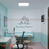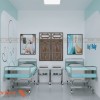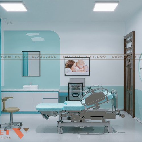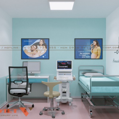 Phòng khám và siêu âm là nơi bác sĩ thực hiện kiểm tra sức khỏe cho thai phụ. Không gian này được thiết kế tối giản nhưng vẫn đầy đủ công năng. Giường khám bệnh có khung inox chắc chắn, nệm bọc simili xanh ngọc đồng bộ với màu sắc tổng thể. Bên cạnh đó, hệ thống tranh treo tường thể hiện các giai đoạn mang thai, giúp bệnh nhân hiểu rõ hơn về quá trình thai kỳ.