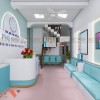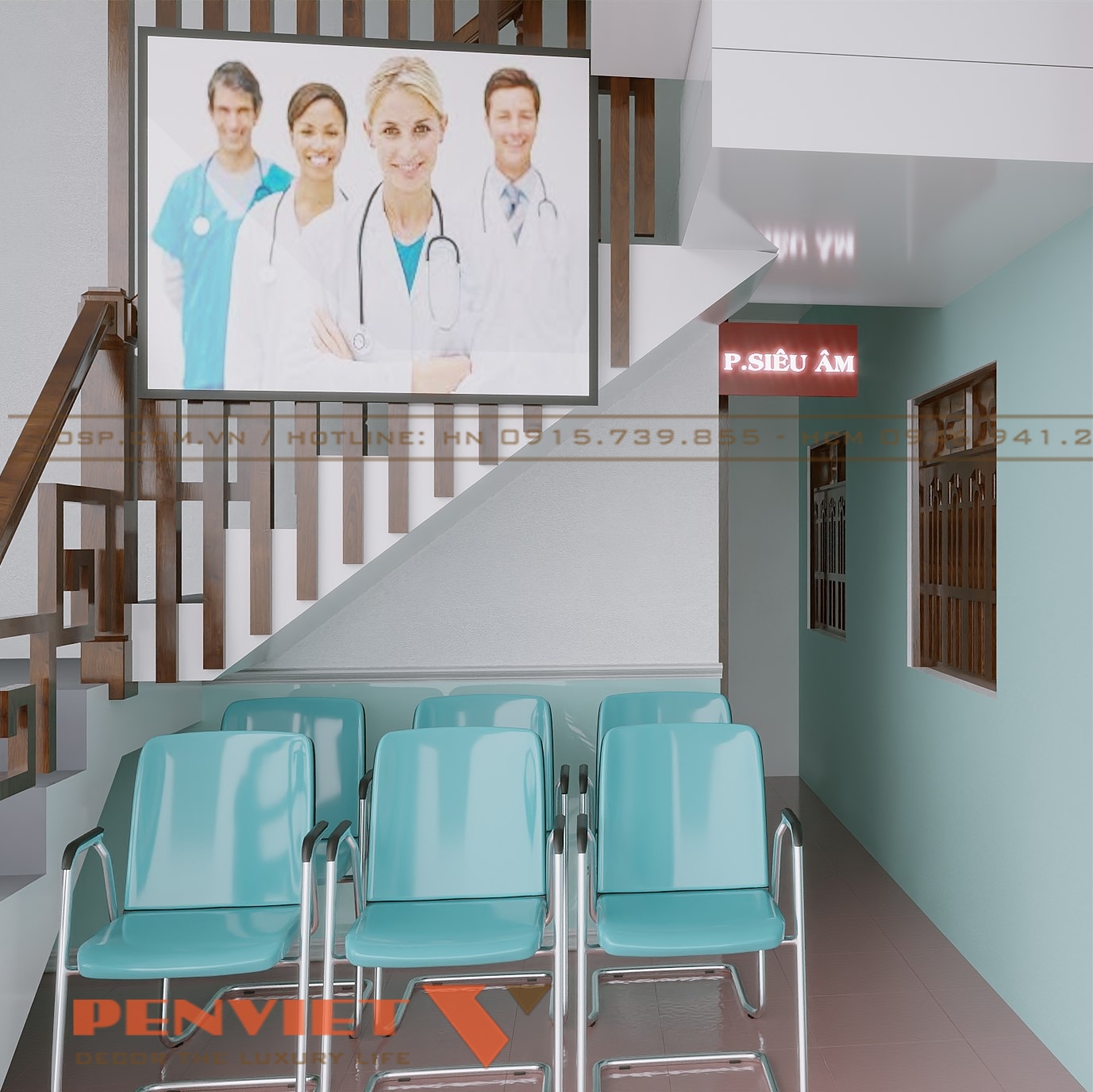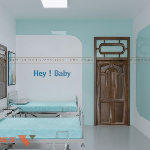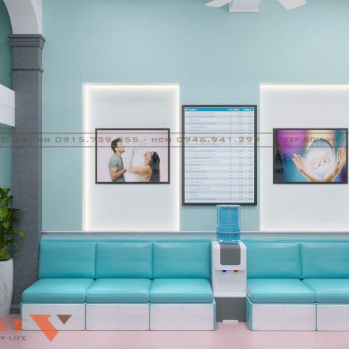 Khu vực phòng chờ rộng rãi, với hệ thống ghế băng dài bọc nệm màu xanh ngọc nhẹ nhàng, giúp bệnh nhân có cảm giác dễ chịu khi ngồi chờ. Trên tường, các bức tranh trang trí liên quan đến chủ đề thai sản, hình ảnh em bé và bác sĩ, tạo sự tin tưởng và kết nối với khách hàng. Ngoài ra, hệ thống đèn LED âm tường được bố trí hợp lý, vừa giúp tăng tính thẩm mỹ vừa tạo không gian sáng sủa.