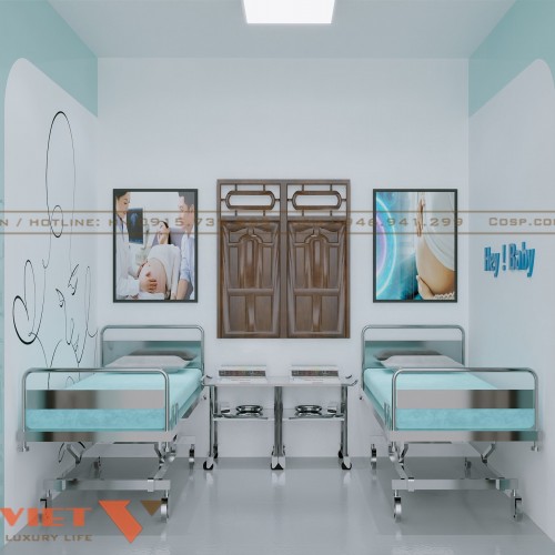Phòng monitor dành cho sản phụ được thiết kế đơn giản nhưng ấm cúng. Hai giường bệnh inox có bánh xe linh hoạt, giúp dễ dàng di chuyển và vệ sinh. Mỗi giường đều có bàn để vật dụng cá nhân. Trên tường là những bức tranh truyền cảm hứng về thai kỳ, tạo cảm giác gần gũi và an tâm cho bệnh nhân.