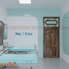 Ngoài ra, phòng còn có các họa tiết trang trí tinh tế như hình vẽ nghệ thuật phác họa mẹ và bé, cùng dòng chữ "Hey! Baby" tạo điểm nhấn nhẹ nhàng. Cửa gỗ màu nâu trầm giúp tăng sự ấm áp cho không gian.