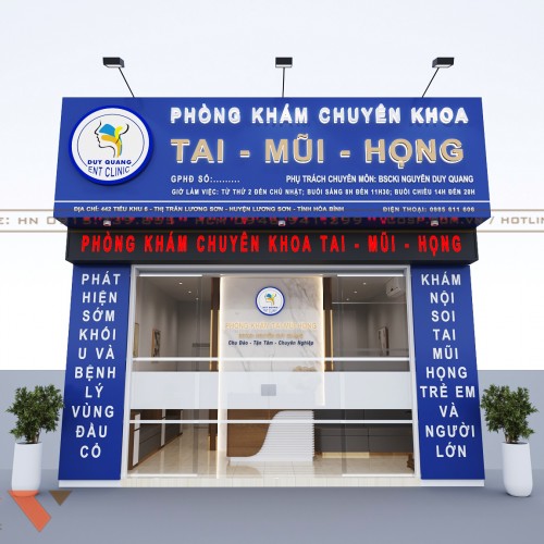 Ngay từ cái nhìn đầu tiên, mặt tiền phòng khám tai mũi họng bác sĩ Nguyễn Duy Quang ghi điểm nhờ thiết kế bảng hiệu lớn màu xanh dương kết hợp chữ mica màu trắng và vàng bắt mắt. Logo phòng khám được đặt ngay chính giữa, thể hiện sự chuyên nghiệp và dễ nhận diện thương hiệu. Biển hiệu lớn với dòng chữ "PHÒNG KHÁM CHUYÊN KHOA TAI - MŨI - HỌNG" in nổi bật tạo ấn tượng mạnh mẽ cho người qua đường, đồng thời khẳng định rõ lĩnh vực chuyên môn.