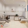 Hai bên quầy tiếp đón là khu vực chờ cho bệnh nhân. Ghế ngồi đơn giản với màu xám trung tính, kết cấu gọn nhẹ. Hệ thống đèn âm trần bố trí hợp lý, mang lại ánh sáng dịu nhẹ, giúp giảm căng thẳng và lo lắng thường gặp ở bệnh nhân khi đến khám.