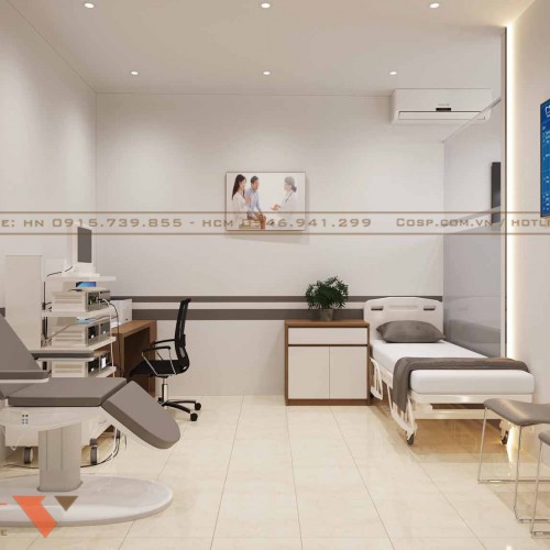 Điểm nhấn trong phòng là ghế khám chuyên dụng tích hợp nhiều chức năng điều chỉnh độ cao, tạo sự tiện nghi khi sử dụng. Bên cạnh là hệ thống nội soi hiện đại với màn hình hiển thị sắc nét, nhiều ngăn chứa dụng cụ gọn gàng. Bàn làm việc đặt sát tường, sử dụng chất liệu gỗ MDF cao cấp, kết hợp ghế xoay tiện lợi.