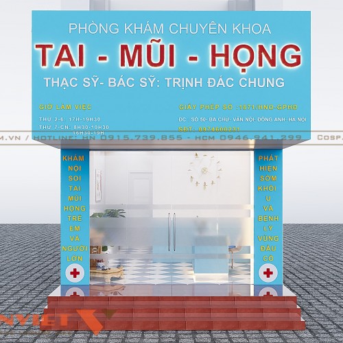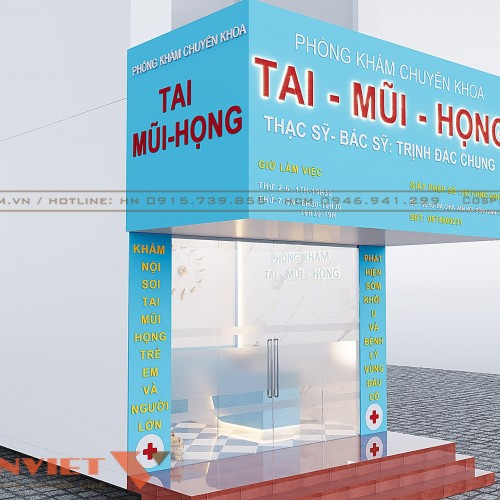 Ngay từ cái nhìn đầu tiên, biển hiệu của thiết kế phòng khám tai mũi họng Thạc sĩ - Bác sĩ Trịnh Đắc Chung gây ấn tượng mạnh với tông màu xanh dương cùng dòng chữ "TAI MŨI HỌNG" màu đỏ nổi bật. Kiểu chữ in hoa, đèn LED chiếu sáng giúp biển hiệu dễ nhận diện vào ban ngày lẫn ban đêm. Phía trên là dòng chữ “PHÒNG KHÁM CHUYÊN KHOA”, khẳng định tính chuyên môn cao của cơ sở.