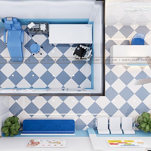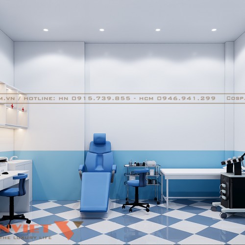 Khu vực khám bệnh được thiết kế kín đáo, sạch sẽ, đảm bảo sự riêng tư cho từng bệnh nhân. Màu chủ đạo vẫn là xanh dương kết hợp trắng, tạo sự thống nhất với khu vực lễ tân.