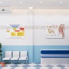 Khu vực chờ dành cho bệnh nhân được bố trí dọc theo hành lang bên trái, nơi có dãy ghế băng màu xanh kết hợp lưng tựa thoải mái, đi kèm một số ghế đơn. Màu sắc hài hòa với thiết kế tổng thể, tạo cảm giác đồng bộ và dễ chịu.