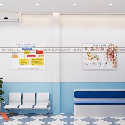 Trên tường được treo các poster y tế, sơ đồ tai mũi họng, cung cấp thông tin trực quan cho người bệnh trong lúc chờ đợi. Hai chậu cây xanh lớn được bố trí cạnh ghế ngồi không chỉ làm đẹp không gian mà còn giúp thanh lọc không khí, mang lại cảm giác thư thái hơn.