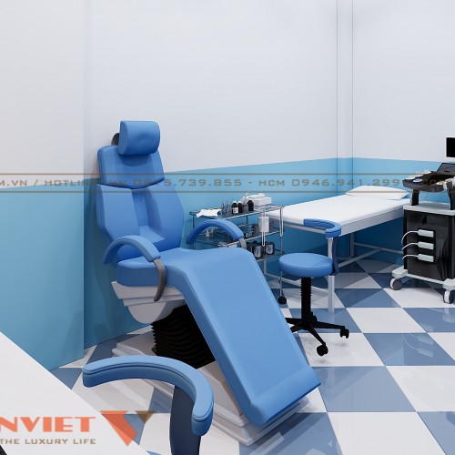 Nội thất trong phòng khám bao gồm ghế khám đa năng điều chỉnh ngả lưng, giường nằm chắc chắn, xe đẩy y tế với nhiều ngăn đựng dụng cụ, máy soi tai mũi họng chuyên nghiệp.