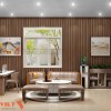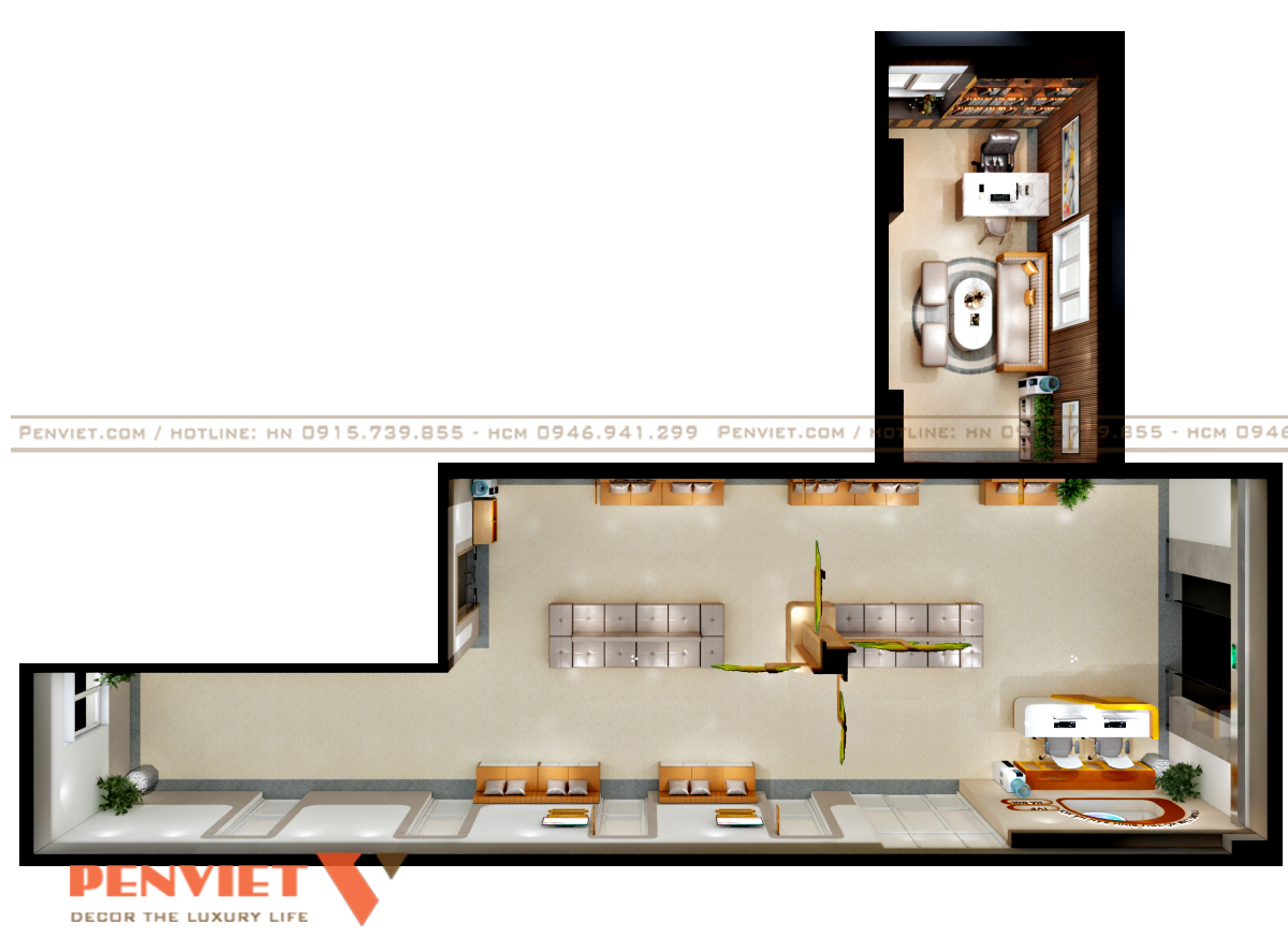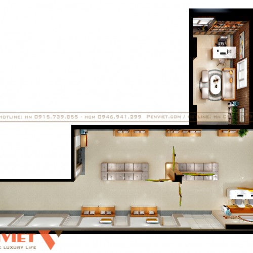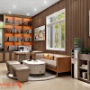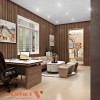 Một điểm nổi bật trong thiết kế là phòng giám đốc được bố trí riêng biệt ở khu vực yên tĩnh. Không gian mang phong cách hiện đại, sử dụng tông màu nâu gỗ kết hợp cam trầm, tạo sự ấm áp và sang trọng.