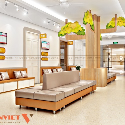 Ghế ngồi dài được bố trí dọc theo tường và khu vực trung tâm, tạo sự cân bằng cho không gian. Chất liệu da dễ lau chùi, đảm bảo vệ sinh y tế. Chi tiết gỗ tự nhiên kết hợp cùng tranh trang trí, mảng xanh và trần đèn LED mang lại cảm giác gần gũi, giảm bớt căng thẳng cho khách hàng.