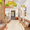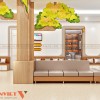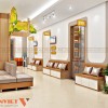 Phía trước quầy lễ tân là khu vực sảnh chờ với ghế ngồi dài bọc da màu be, kết hợp cùng chi tiết gỗ và trang trí cây xanh. Không gian thoáng đãng, sạch sẽ, đáp ứng nhu cầu ngồi chờ của nhiều khách hàng cùng lúc.