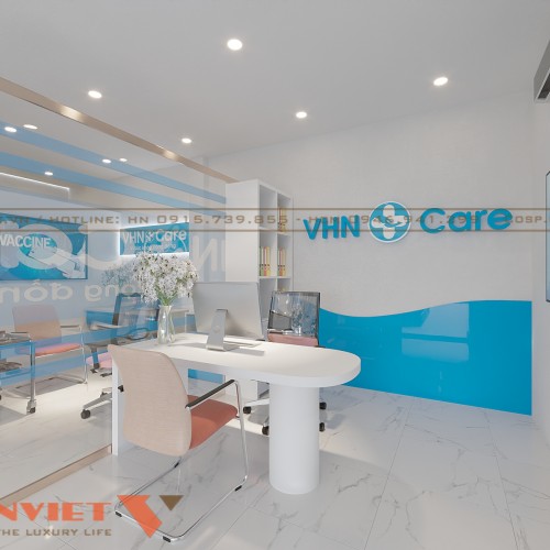Khu làm việc của nhân viên y tế: được ngăn cách bằng hệ vách kính mờ có logo thương hiệu VHN Care, tạo sự riêng tư nhưng vẫn giữ được sự thông thoáng và liền mạch thị giác.