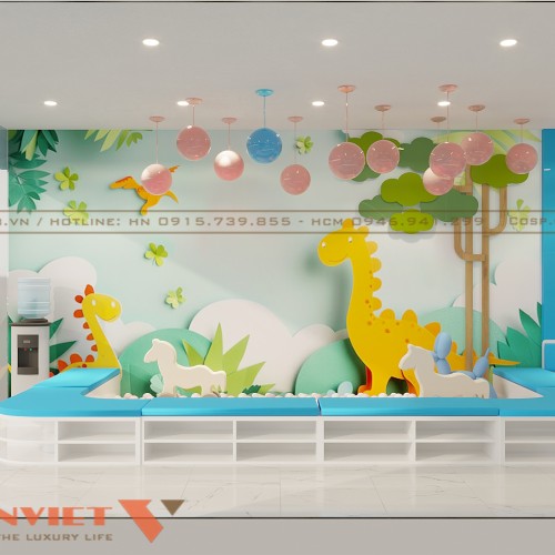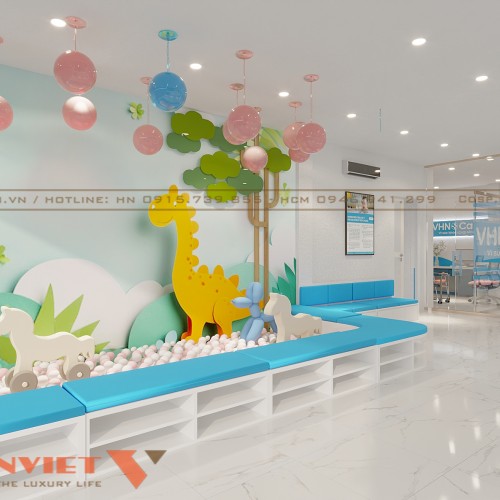 Đặc biệt, thiết kế nổi bật nhất trong khu vực này chính là khu vui chơi mini cho trẻ em với hồ bóng sắc màu pastel an toàn, sạch sẽ. Đây là điểm cộng lớn trong thiết kế, giúp phụ huynh yên tâm khi đưa trẻ đi tiêm và khiến trẻ nhỏ cảm thấy thoải mái hơn với môi trường y tế.