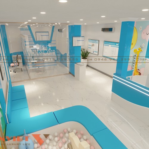 Tông màu chính: trắng tinh khôi kết hợp xanh và hồng pastel nhẹ nhàng giúp không gian luôn sáng sủa, thân thiện mà không lạnh lẽo. Điều này đặc biệt phù hợp với trẻ em, đối tượng thường lo sợ khi đến nơi tiêm chủng.