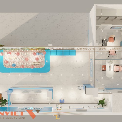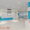Ngay từ cửa vào, khách hàng được dẫn dắt vào quầy lễ tân hiện đại và thân thiện, với quầy trắng viền xanh tạo điểm nhấn thị giác. Không gian chờ được bố trí ngay sau quầy lễ tân với hàng ghế dài bọc nệm xanh lam tạo cảm giác dễ chịu, cùng hệ thống ánh sáng trần đồng bộ mang lại sự thư giãn và thoải mái cho người ngồi chờ.