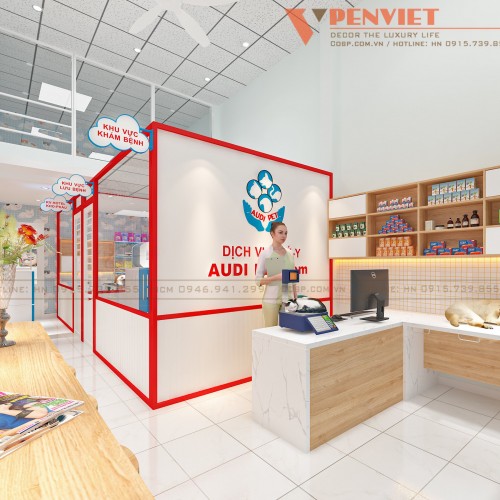 Các kiến trúc sư PenViet đưa ra phương án tăng cường nhận diện thương hiệu cho thiết kế phòng khám thú ý Audi Pet bằng cách setup vách ngăn bằng gỗ MDF phủ Melamine và khung sắt sơn màu làm nổi bật logo và tên cửa hiệu bằng Mica dẹp cắt CNC.