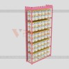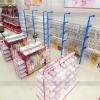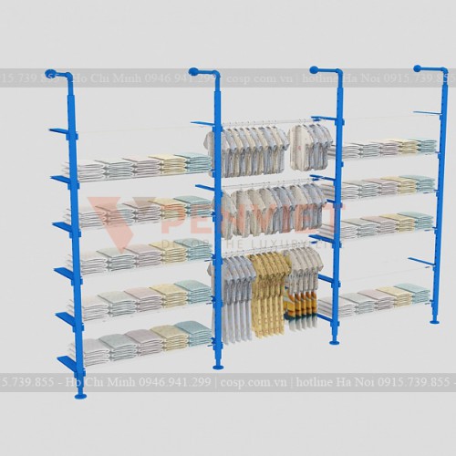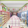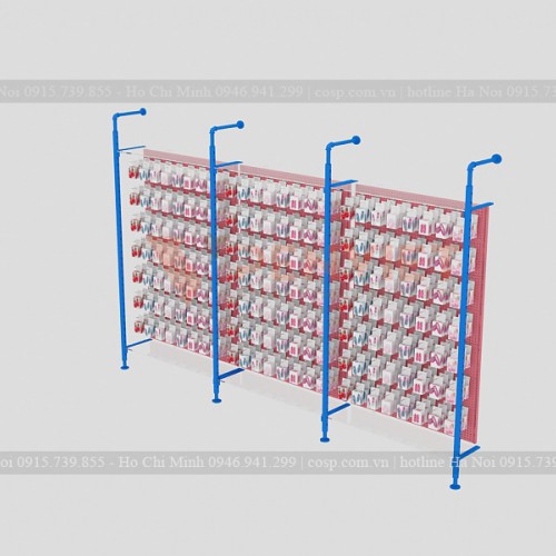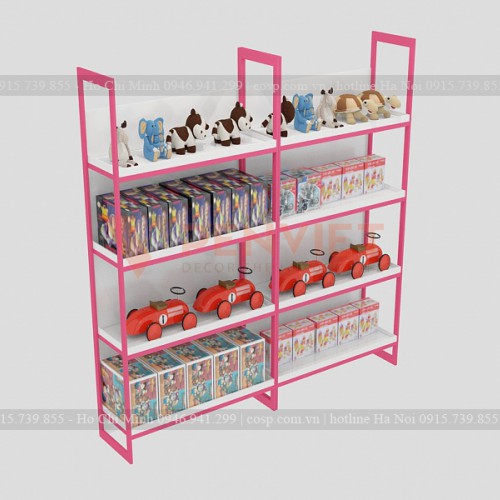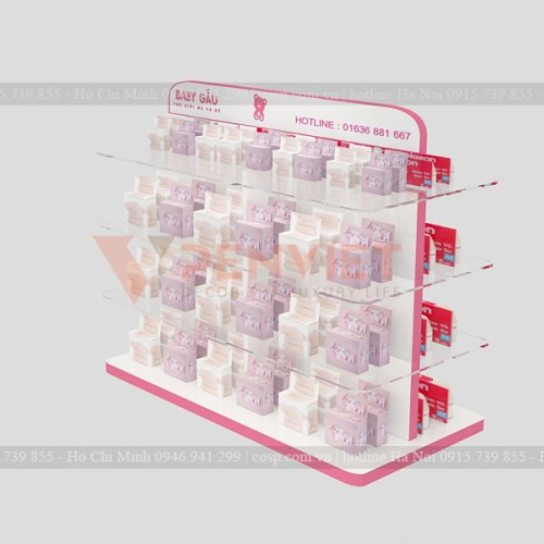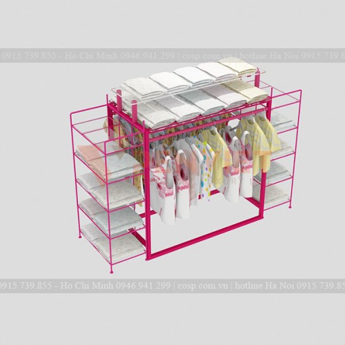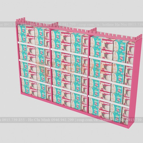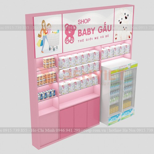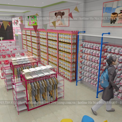 Nội thất kệ tủ thiết kế shop mẹ và bé Baby Gấu đang dạng từ chất liệu cho đến kiểu dáng sao cho thích hợp với từng khu vực và vị trí trưng bày. Từ tủ hộp cho đến kệ lưới sắt, kệ móc treo,.. tất cả đều được phun sơn tĩnh điện màu hồng và xanh đại dương năng động. Để tạo cảm giác mua sắm thoải mái cho khách hàng, chúng tôi quyết định kê tủ áp sát tường dọc theo chiều sâu của không gian. Các lối đi hai bên được ngăn cách bởi các kệ nhỏ ở giữa cửa hàng.
