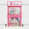 Bảng hiệu chiếm vị trí quan trọng trong thiết kế shop mẹ và bé. Thể hiện đầy đủ tên và địa chỉ kinh doanh, bảng hiệu còn được thiết kế điểm nhấn bởi slogan ấm áp. Ngoài bảng chính ở vị cao nhất. các kiến trúc sư đã thiết kế thêm bảng hiệu giới thiệu đầy đủ các sản phẩm cửa hàng kinh đang kinh doanh. Màu nền hồng và chữ trắng nổi bật đã làm rất tốt nhiệm vụ của nó.
