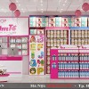 Chúng tôi đã tiến hành lắp đặt hệ kệ, tủ sát tường để trưng bày sản phẩm. Ưu điểm của chúng là khả năng tiết kiệm diện tích và tối ưu hóa không gian, vậy nên rất thích hợp để sử dụng trong mẫu thiết kế shop mẹ và bé Jim Tồ bởi diện tích không quá lớn. Bên cạnh đó, màu sơn trắng và hồng được phối hợp rất hài hòa và bắt mắt, tạo nên vẻ đẹp đáng yêu, ngộ nghĩnh, góp phần hấp dẫn các bé.
