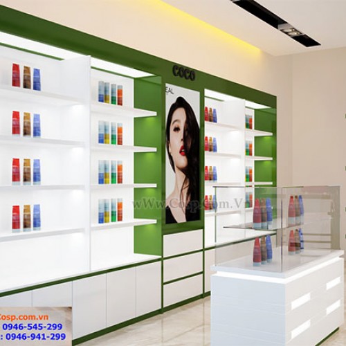 Mẫu thiet ke shop my pham này tiện lợi, gọn gàng, không gian khoa học , nội thất được sắp xếp thông minh và ánh sáng màu sắc cũng được ưng ý.