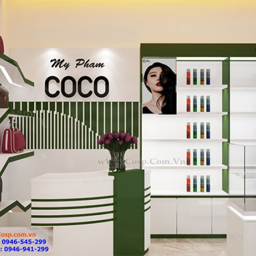 Thiết kế shop mỹ phẩm có tên COCO với tone màu xanh trắng là chủ đạo. Với diện tích là 12m2 đây cũng có thể gọi là một mẫu thiết kế shop mỹ phẩm nhỏ xinh do nội thất Cosp thiết kế. Để hoàn thành mẫu này mà vẫn phải khiến cho không gian thoáng mát thì các kiến trúc sư chắc chắn phải dầy dặn kinh nghiệm.