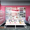 Phía sau quầy thu ngân bài trí với viền khung sắt hộp sơn tĩnh điện kết hợp lưới hàn sắt tạo thành các panel được trang trí gam màu hồng trắng làm tôn lên các sản phẩm được trưng bày và giúp không gian thêm sáng sủa, thoáng đãng.