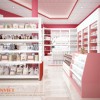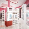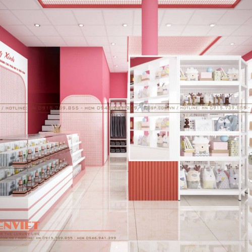 Sự kết hợp màu sắc hài hòa giữa các chi tiết nội thất với gam màu hồng ngọt ngào cùng hệ thống quầy kệ hậu MDF đã góp phần tạo nên một hình ảnh sinh động, bắt mắt, làm nổi bật các sản phẩm được trưng bày trong cửa tiệm.