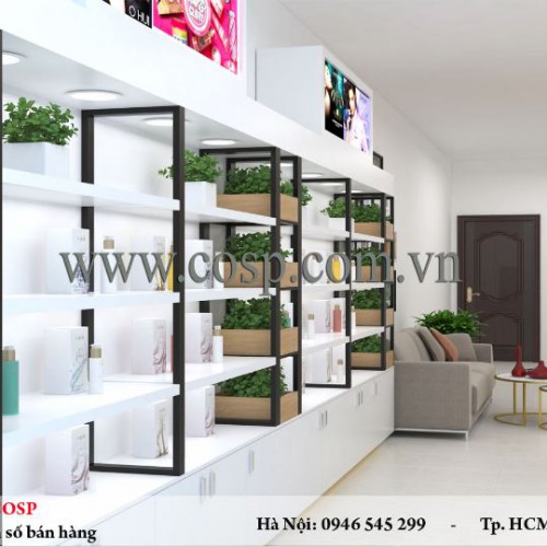 Khả năng trưng bày các sản phẩm được làm nổi bật giúp thu hút sự chú ý của khác hàng. Đặc biệt còn thiết kê các chậu cây cảnh cỡ nhỏ tạo nên vẻ thân thiện cũng như tính độc đáo của mẫu thiết kế cửa hàng mỹ phẩm.