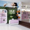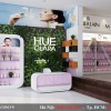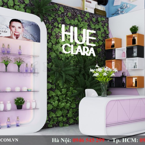Khu vực quầy thu ngân khá ấn tượng, chiếm một diện tích nhỏ trong không gian shop mỹ phẩm nhưng lại vô cùng bắt mắt. Tên cửa hàng “HUE CLARA” sử dụng chữ mica phát sáng được treo nổi bật phía sau tấm cỏ giả nhân tạo, mang tới cảm giác dễ chịu và thu hút khách hàng ngay khi bước vào trong shop.